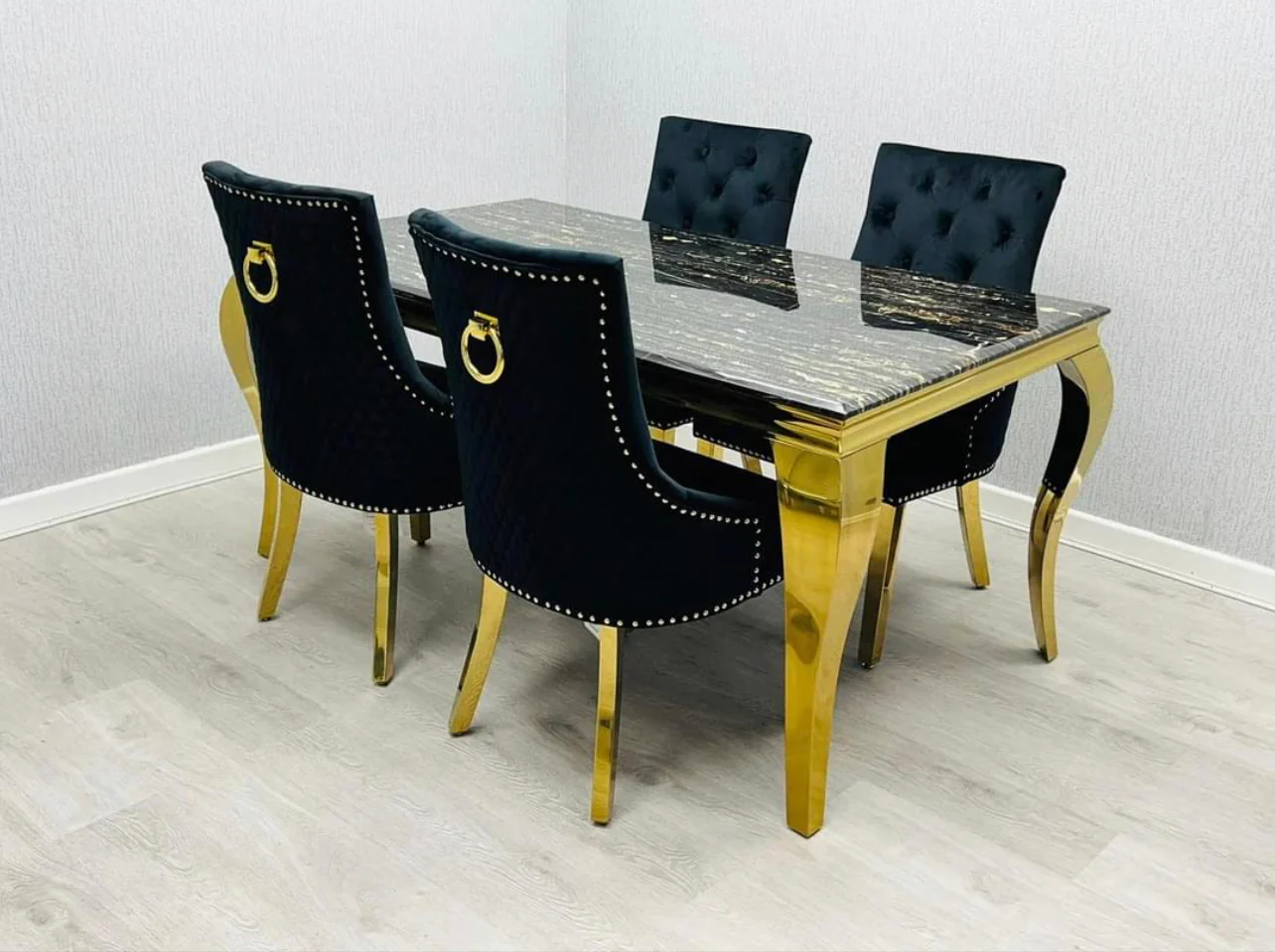 Our sophisticated dining set features a lavish aesthetic, combining a black marble tabletop with gold-finished, curved stainless steel legs.