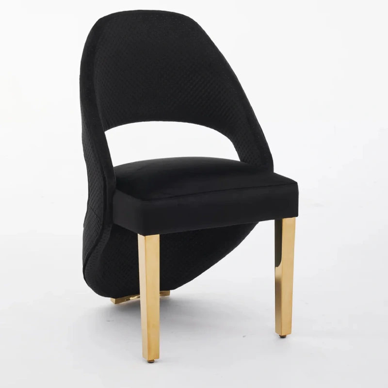Turn your dining area into a haven of style and luxury with the Santorini Gold Dining Chairs available in Black velvet. These chairs have sleek Gold legs, which make any dining room look sophisticated and modern. Designed for comfort and beauty, the chair boasts a curved, fan-back silhouette and an open backrest.