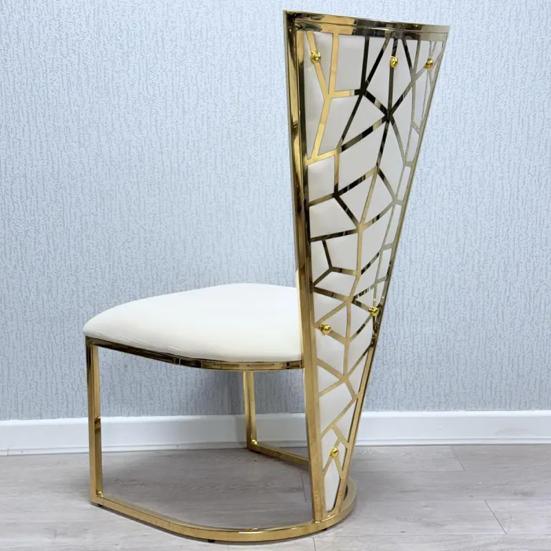Enjoy the comfort and luxury of our high-back dining chair, featuring a unique, symmetrical backrest design. This chair features a cream velvet-covered seat and backrest, complemented by a gold-polished stainless steel frame and legs. It combines luxury and modern design elements, creating an opulent and glamorous look.