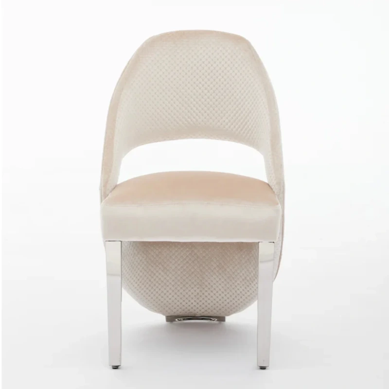 Elevate your dining space with the Santorini dining chair, a contemporary piece featuring plush cream velvet padding and silver chrome legs. It has two supportive arms for a truly ergonomic experience and style. Its elegant design and sturdy construction make it the ideal piece for formal dining settings, offering both comfort and sophistication. Mostly described as the Santorini Dining Chair, this piece is finished in luxurious fabric or leather for added elegance.