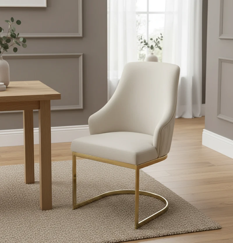 Our velvet dining chairs can be a standout addition to your dining room. It's upholstered in plush velvet or a similar fabric in colours like taupe, beige, cream, or off-white, which effortlessly blends with any room decor styles and tables. The sleek, curved U-shaped base made of gold-finished metal assures you of stability. Whether you're using these chairs for daily meals or for hosting your visitors, these chairs bring both functionality and elegance to your home.