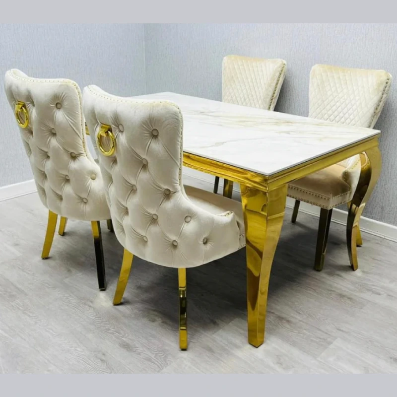 This dining table features a cream or white top with a marble effect, which is supported by a gold-colored frame and legs.