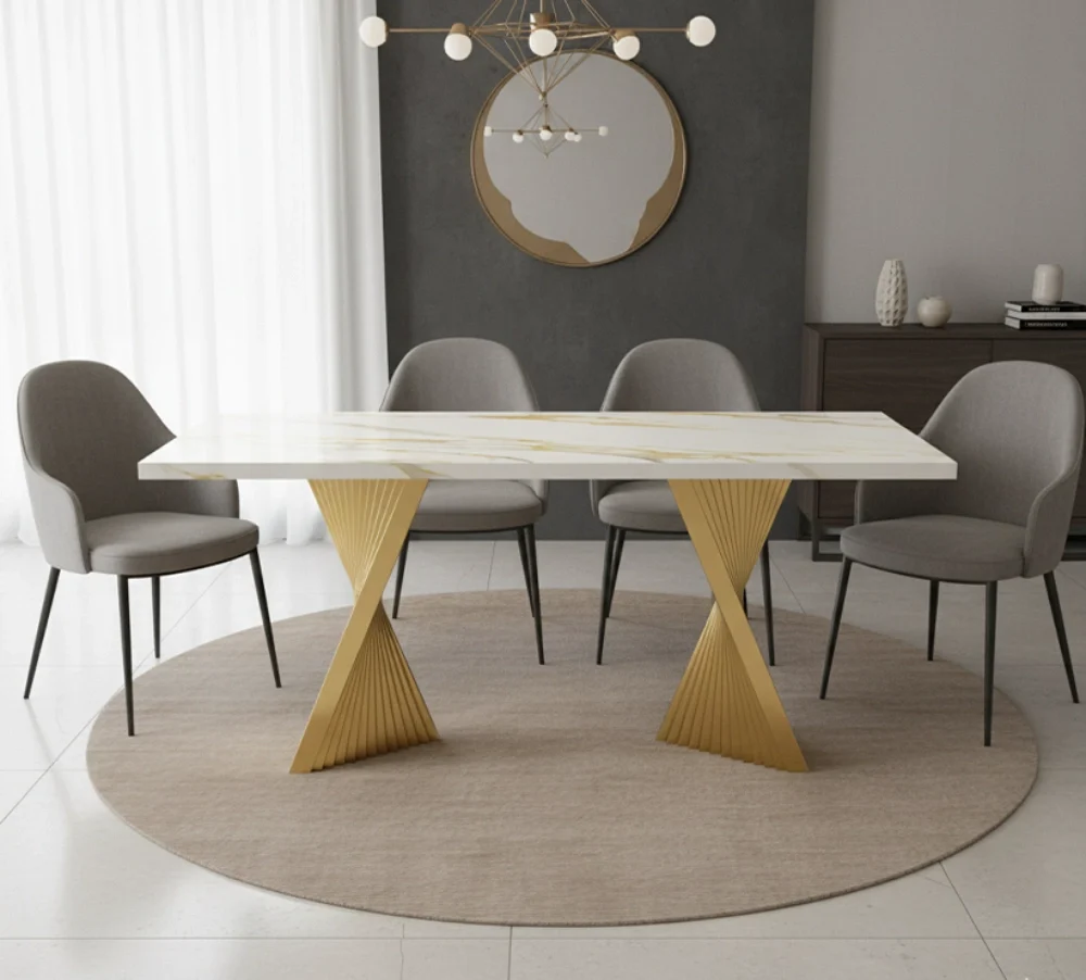 The twisted, pleated gold pedestals give it a dynamic sense of movement that contrasts beautifully with the heavy, veined marble-style top. Ideal for all types of settings, this beautiful Rectangular Pedestal Dining Table adds elegance to your dining experience.
