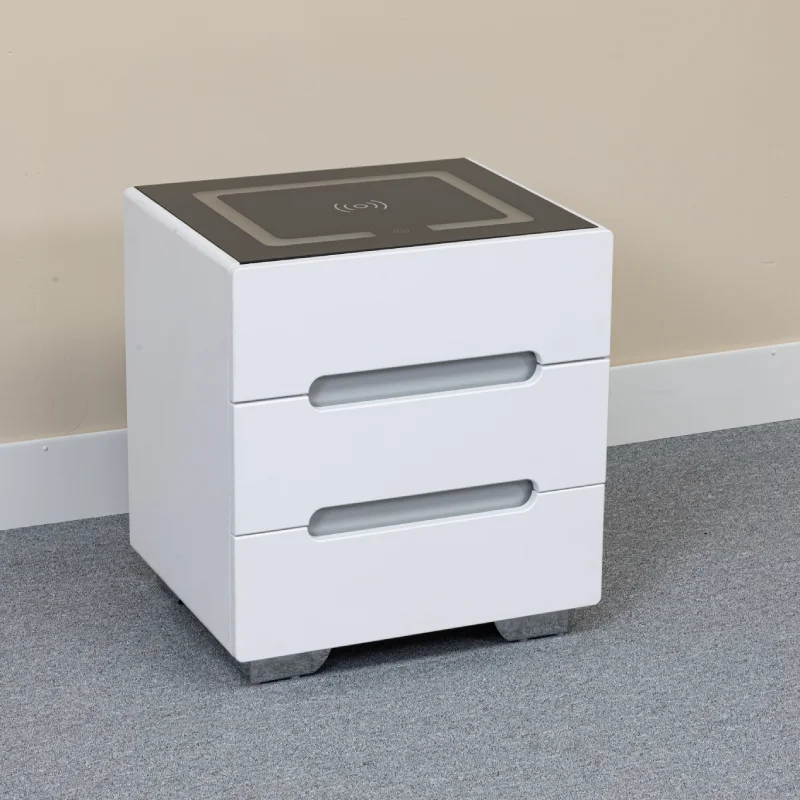 Improve your bedroom space with the perfect blend of high-tech functionality and contemporary luxury. This sleek, minimalist nightstand is designed for the modern lifestyle, offering integrated power solutions without sacrificing style.