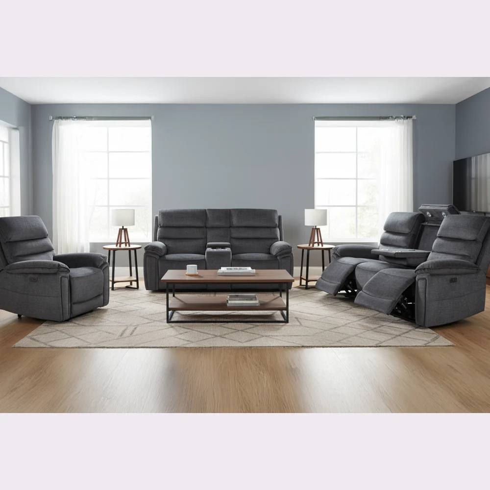 This three-piece recliner sofa set screams comfort. It could be your favourite spot in the house. The reclining mechanism works smoothly, so adjusting your seat is simple. Just lean back, lift your feet and settle in.