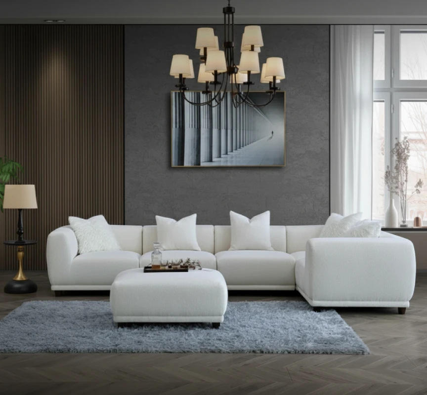 Corner sofa set designed for stretching and settling in. The clean white finish brightens the room, and the generous corner layout gives everyone their own space.